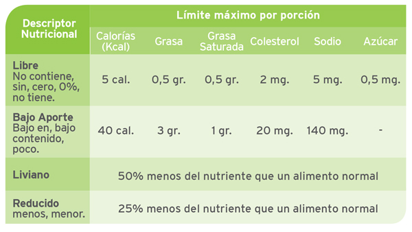 El etiquetado nutricional también tiene mensajes específicos sobre cada nutriente, conocidos como los desc r i p tores nut r i c i o n a les, relacionados con los alimentos y la salud: libre de, bajo aporte en, buena fuente de, alto en, reducido en, liviano en, fortificado, extra magro y muy bajo en sodio.